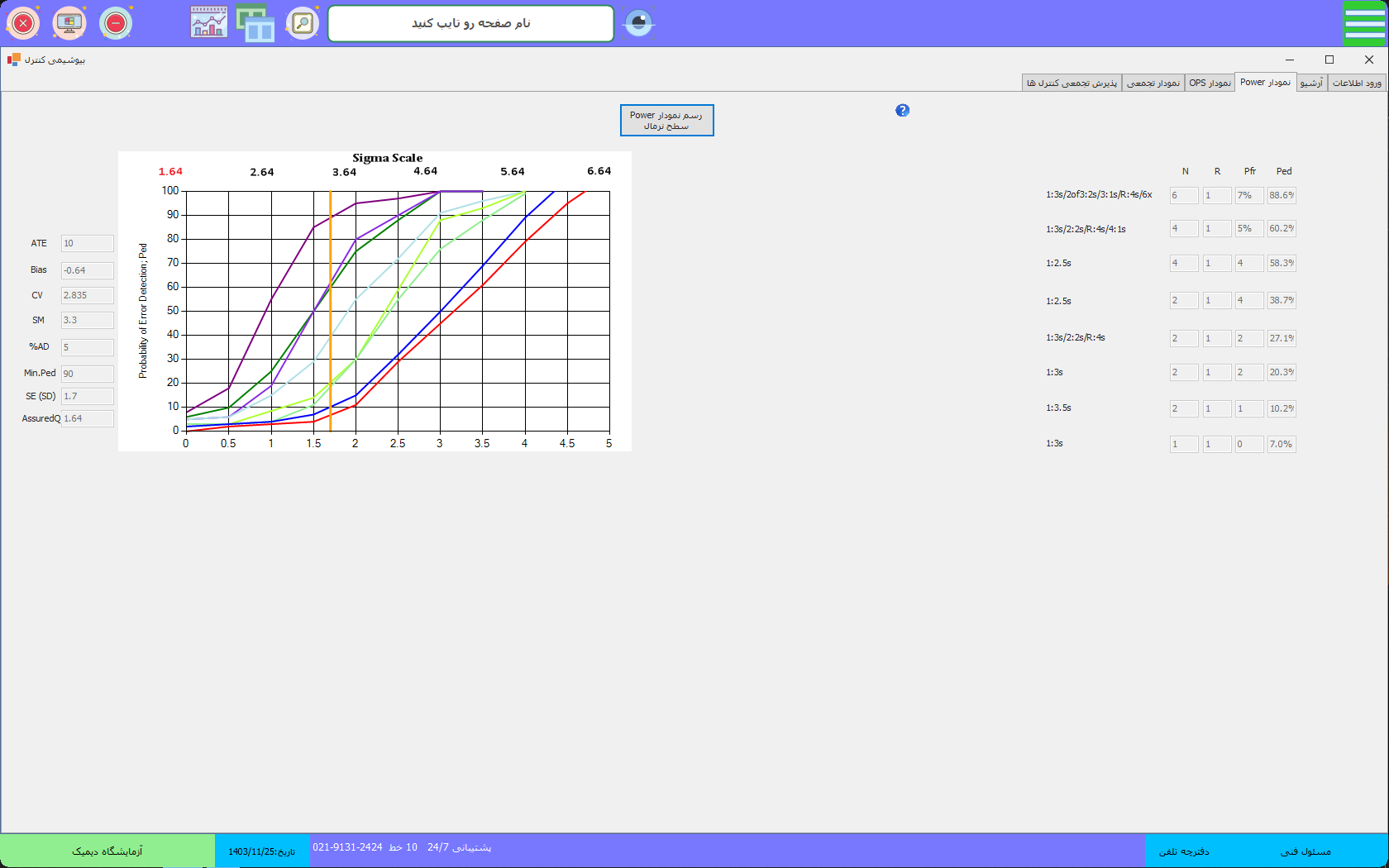 منوی جامع کنترل کیفیت این نرم افزار دارای بخش های متنوع جهت دردسترس بودن و کاربر پسند بودن طراحی شده است . در بخش کنترل کیفیت روزانه بخش ها، شما میتوانید عیار سیگما ، مقایسه خطای مجاز آزمایشگاه خود و خطای مجاز قابل قبول ، مقایسه خطای کل مجاز و خطای کل مجاز قابل قبول و خطای سیستماتیک و تصادفی سنجش های خود را محاسبه و مشاهده کنید.