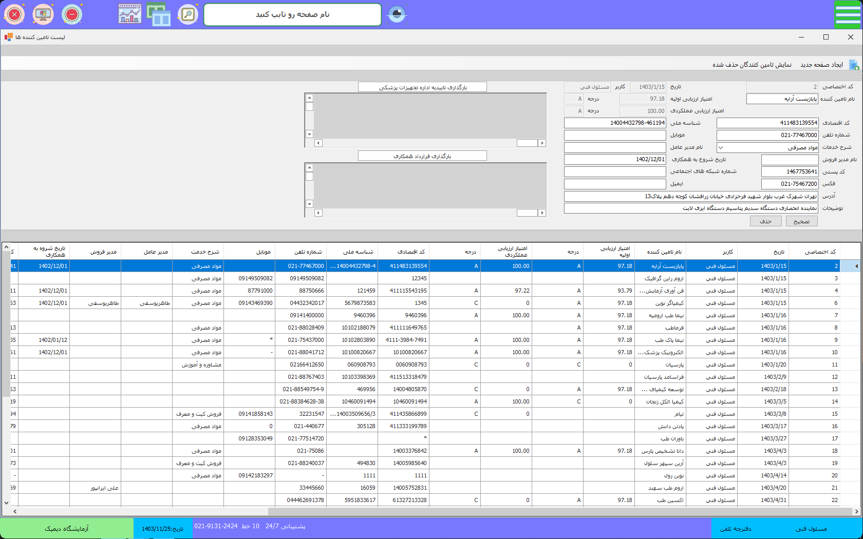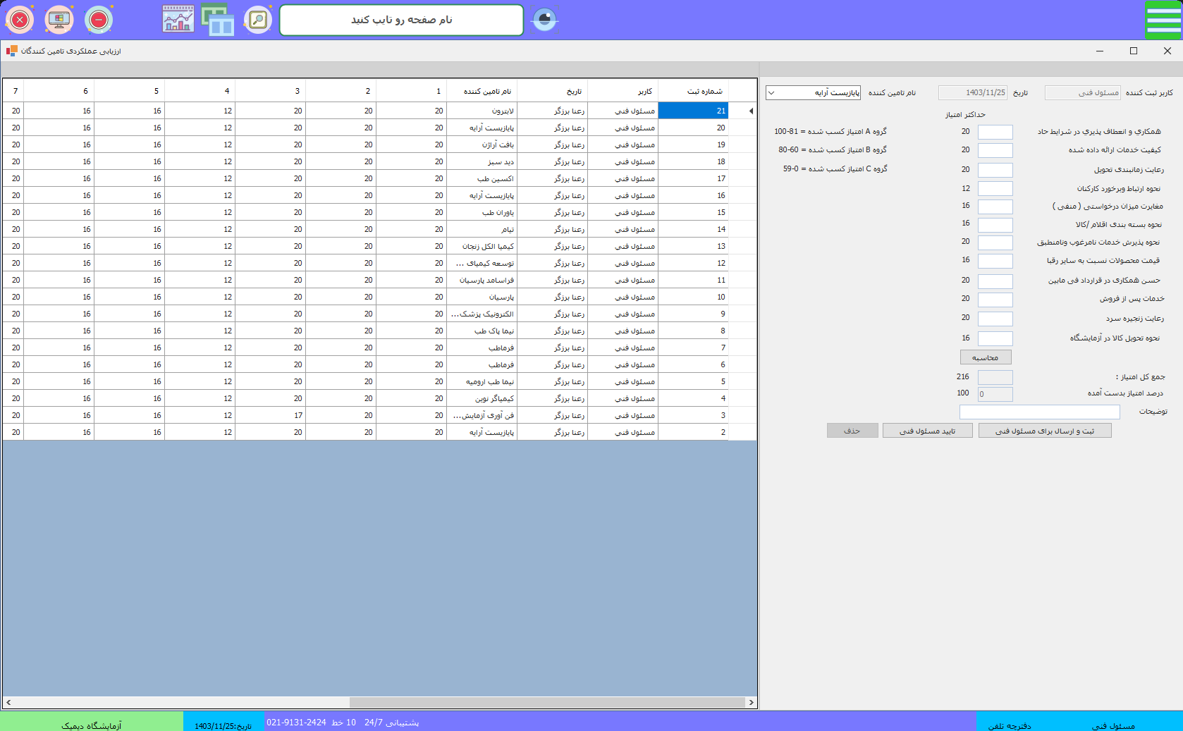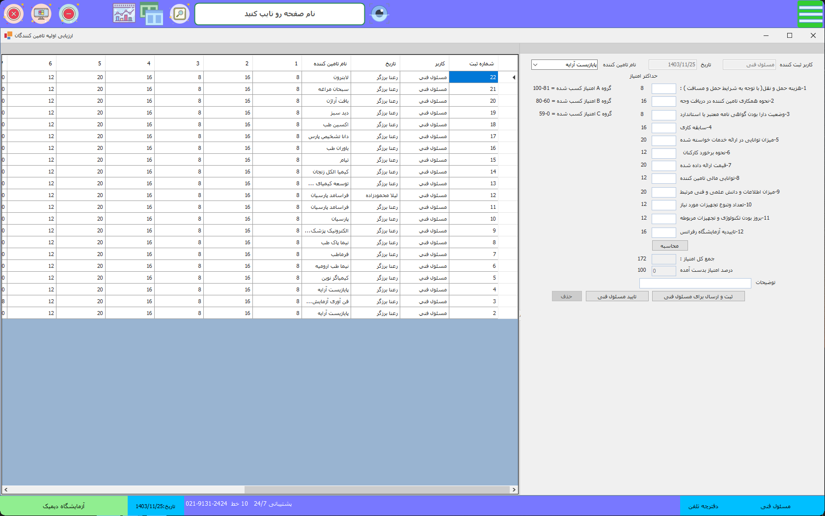 لیست تامین کنندگان و ارزیابی های عملکردی و اولیه تامین کنندگان را در این بخش خواهید داشت. لطفا در این قسمت تمامی تامین کنندگان خود را وارد کنید و تماممی اطلاعات را به صورت کامل وارد کنید . در ادامه باید دو ارزیابی را انجام دهید . ارزیابی اولیه و ارزیابی عملکردی را کامل کنید و در ادامه تایید میئول فنی را حتما انجام دهید .