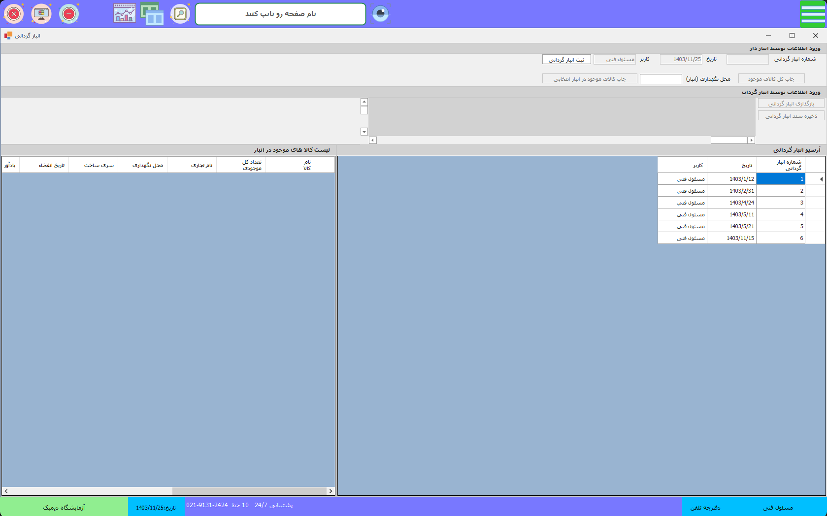 انبارگردانی به صورت سالیانه انجام میشود . لطفا در این بخش ثبت انبارگردانی را بزنید. و کالاهای خود را چاپ بگیرید. شما میتوانید در پایان کار انبارگردانی خود مستنداتی را که تهیه کردید به صورت فایل PDF بارگذاری کنید