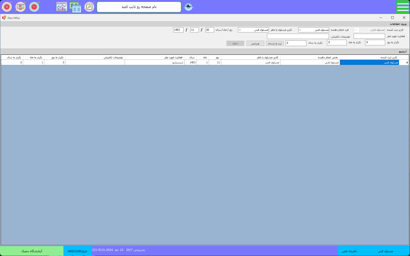 در تمام آزمایشگاه ها فعالیت هایی هستند که نیاز به صورت دوره ای به پرسنل یادآوری شود مانند کالیبراسیون دستگاه ها یا شستشوی دستگاه ها و یا سرویس دستگاه ها و ... . نرم افزار حاضر در بخش زمان بندی اجرایی میتواند فعالیت های مورد نظر شما را در موعد مقرر به شما یادآوری کند . بدین صورت که فرد انجام دهنده را که یکی از پرسنل آزمایشگاه شما است را مشخص کنید و کاربر مسئول یا ناظر را مسئول فنی محترم قرار دهید .
